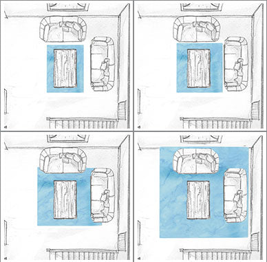 Also, the rug size should be large enough to allow a symmetrical border of exposed flooring on all four sides. If the room does not allow for symmetrical positioning, choose a size that will provide equal borders top and bottom, and side to side.
