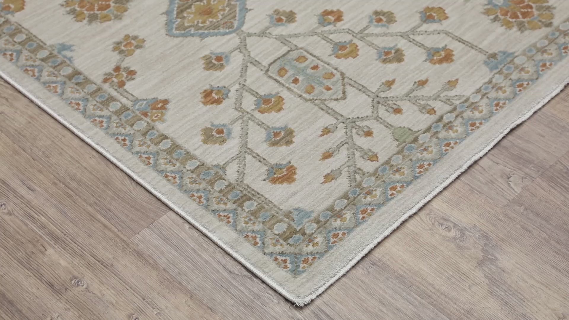 The Maeve collection features subtly pigmented color palette features neutral tones of ash brown, oat milk and sustained gray as well as mineral-based blues, matcha green, sunbaked clay and antique gold. The quietly modern color palette gives fresh appeal to traditional Persian and block print patterns with a touch of bohemian flair. It is power-loomed of super-soft, space-dyed polypropylene.