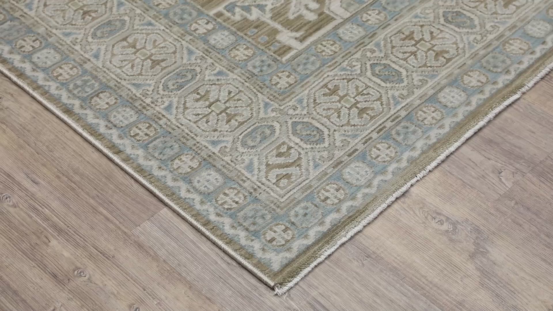 The Maeve collection features subtly pigmented color palette features neutral tones of ash brown, oat milk and sustained gray as well as mineral-based blues, matcha green, sunbaked clay and antique gold. The quietly modern color palette gives fresh appeal to traditional Persian and block print patterns with a touch of bohemian flair. It is power-loomed of super-soft, space-dyed polypropylene.