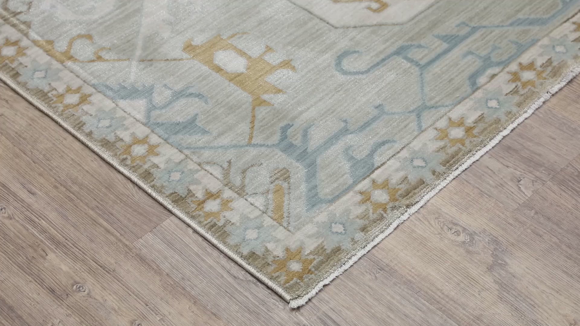 The Maeve collection features subtly pigmented color palette features neutral tones of ash brown, oat milk and sustained gray as well as mineral-based blues, matcha green, sunbaked clay and antique gold. The quietly modern color palette gives fresh appeal to traditional Persian and block print patterns with a touch of bohemian flair. It is power-loomed of super-soft, space-dyed polypropylene.