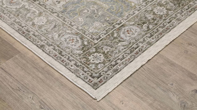 Maharaja is a study in understated elegance. This million point collection is full of sophisticated traditional designs that have been re-imagined into a lovely new color palette. Timeless neutral tones alongside mellow shades of bluestone and muted amber offer subtle treatments for intricately detailed patterns. These beautiful rugs are powerloomed of incredibly soft, space-dyed polyester.
