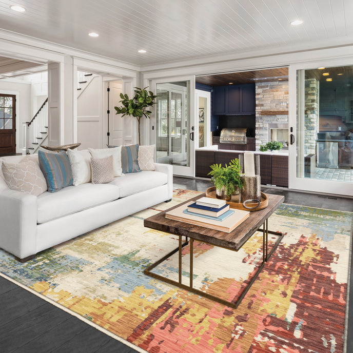 The Soleri collection features modern abstract designs beautifully colored in vibrant shades of pink, blue, green and gold. The space-dyed wool and nylon blend is cross-woven on an Axminster loom and features incorporated cotton fringe. Made in Egypt.
