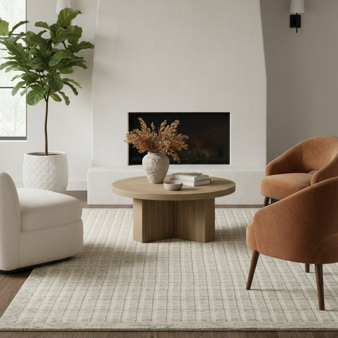 The Thatcher Collection showcases modern geometric designs brought to life through a hand-loomed cut and loop pile construction, for added surface interest and tactile appeal. Crafted from space-dyed PET yarn - a sustainable material made from recycled plastic bottles – Thatcher has the look of wool but much less likely to shed and easier to clean. Nature-inspired colorations, from warm sand and soft clay to brushed sage and watery blue, lend a grounded, organic look to any space.